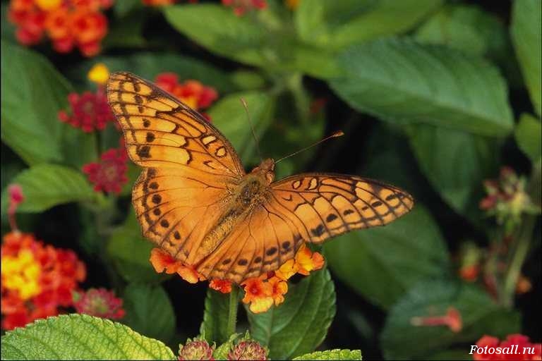 Оранжевая бабочка среди цветов.