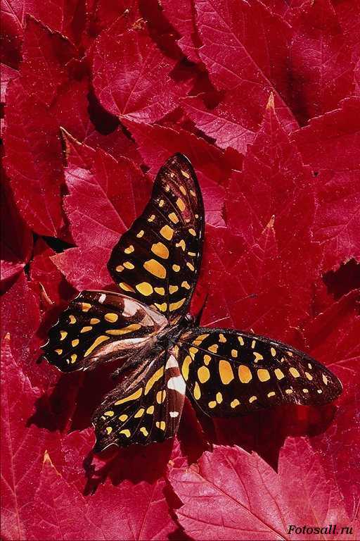Бабочка на красных листьях.